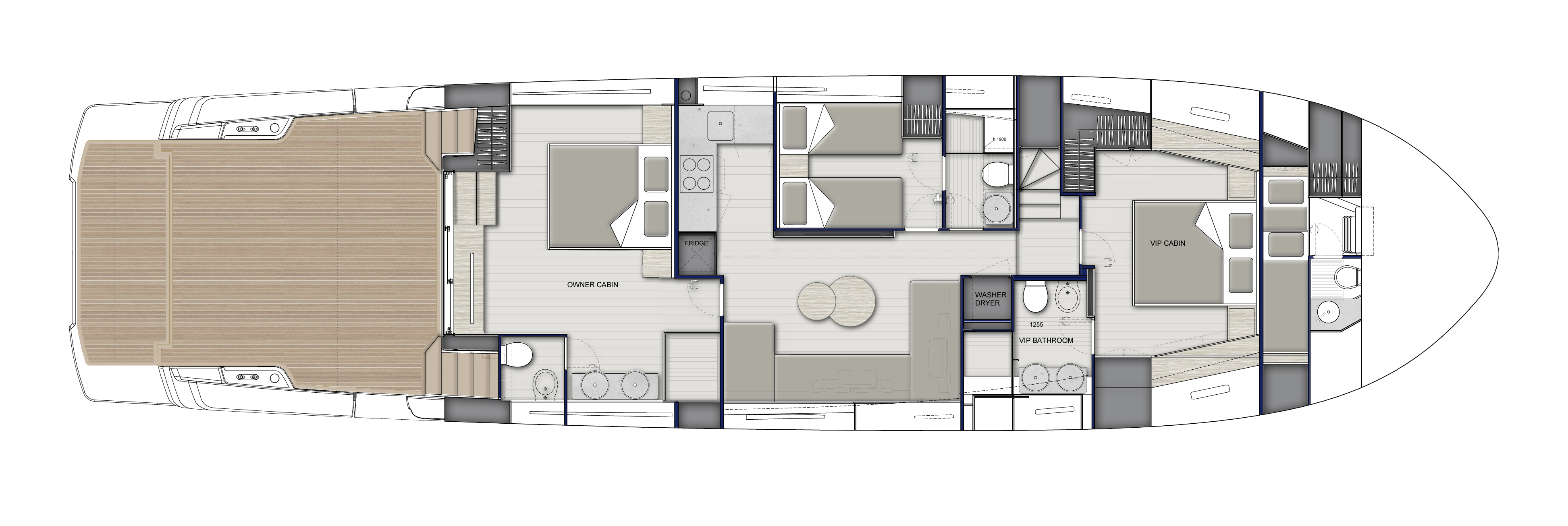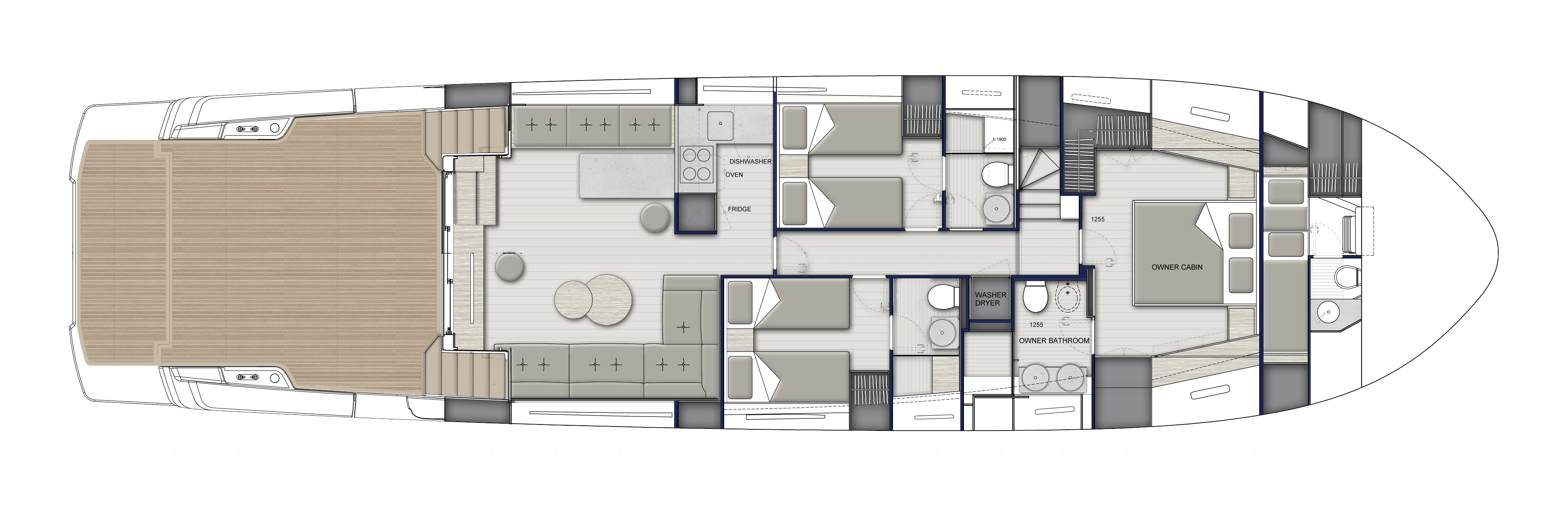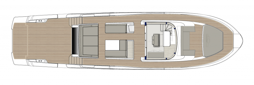 The owner of the vessel that was be presented at the Boat Shows 2021 (Cannes Yachting Festival, Monaco Yacht Show and Genoa Boat Show) chose the version with the saloon overlooking the beach area and interiors with very distinctive materials and colors: Canaletto walnut wood combined with leather and fabrics in light and blue tones that convey personality and sophistication.